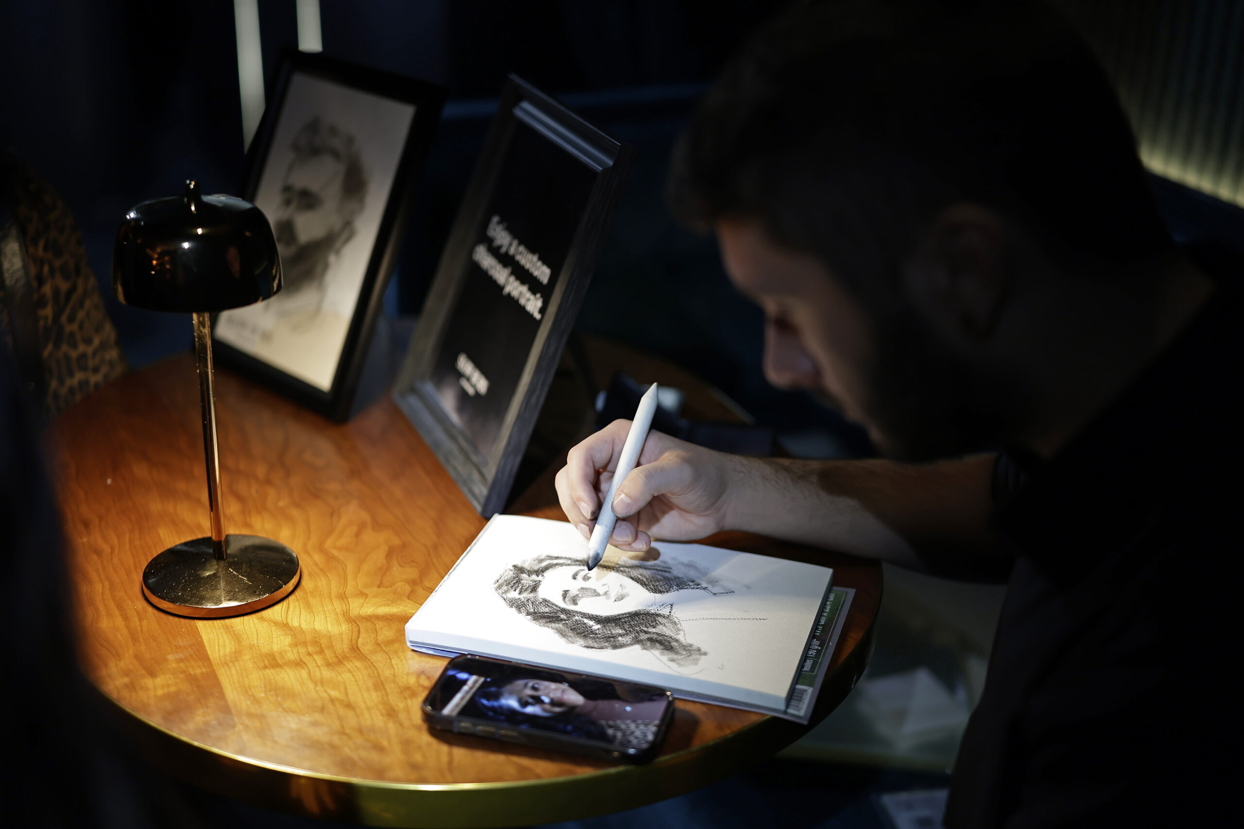 As guests explored the activation, skilled artists created charcoal portraits live on-site. The medium mirrored the fragrance notes — charred hardwood, smoke, and warmth — reinforcing the brand story visually while the scent worked in the background.