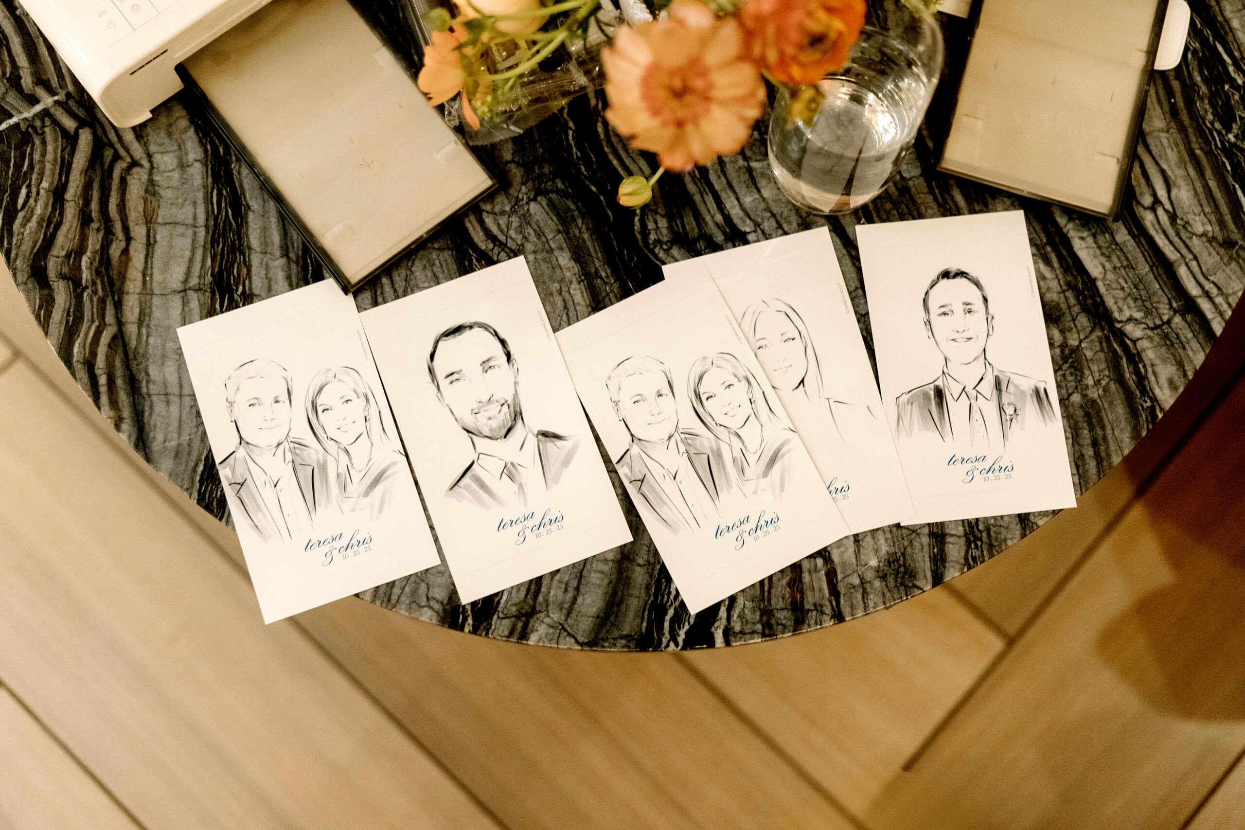 A collection of custom wedding guest portraits illustrated live by Drawing Booth artists and displayed as refined event favors. These quick, hand-sketched portraits double as meaningful take-home keepsakes, adding a personal, artistic touch to weddings, receptions, and private celebrations while enhancing the overall guest experience.